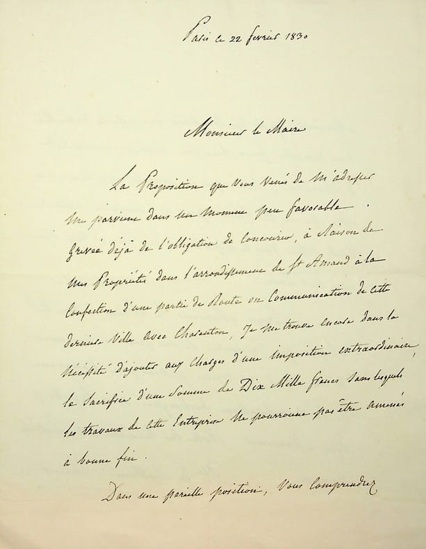 Maximilienne de Béthune (1772-1833), duchesse de Béthune-Charost. L.A.S., Paris, 22 février 1830, 2p in-4. Probablement à Jean Thabaud-Linetière (1786-1867), député de l'Indre, maire d'Issoudun. A propos du financement de routes par la duchesse. Elle refuse de participer au financement d'une route d'Issoudun vers le Cher, ayant déjà plusieurs autres routes à financer. [353]