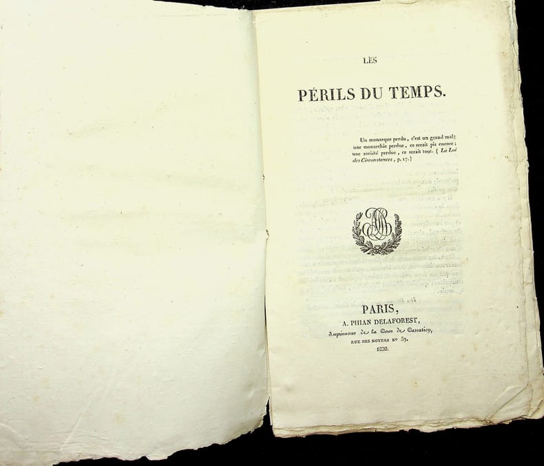 Marquis de La Gervaisais, Les Périls du temps. Paris, A Pihan Delaforest, 1830. In-12, 39p. Edition originale d'une des très nombreuses plaquettes politiques de La Gervaisais, qui fut surnommé « prophète » tant il prédisait dans ses brochures. Sous couverture muette, non coupé. Cette plaquette de commentaires politiques, qui aurait été écrite dès 1829 et diffusée alors auprès de ministres, a ici été imprimée en octobre 1830 pour être diffusée auprès des chambres. Elle contient notamment des considérations sur 1789 et 1792 et le parallèle possible avec l'époque. Peu commun. [VI]
