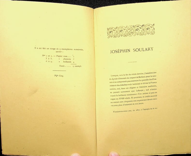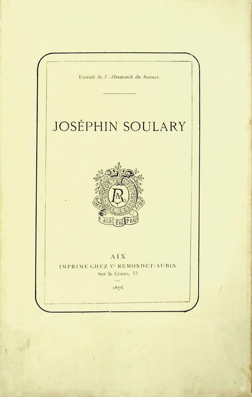 G. Hipp, Joséphin Soulary. Aix-en-Provence, veuve Remondet-Aubin, 1876. In-8, 13p. Edition originale, un des 9 exemplaires numérotés, le nôtre un des 3 sur papier chamois (avec 2 sur papier rose et 4 sur papier hollande), tiré à part de l'Almanach du Sonnet. Couverture légèrement salie. Rare. [VI]