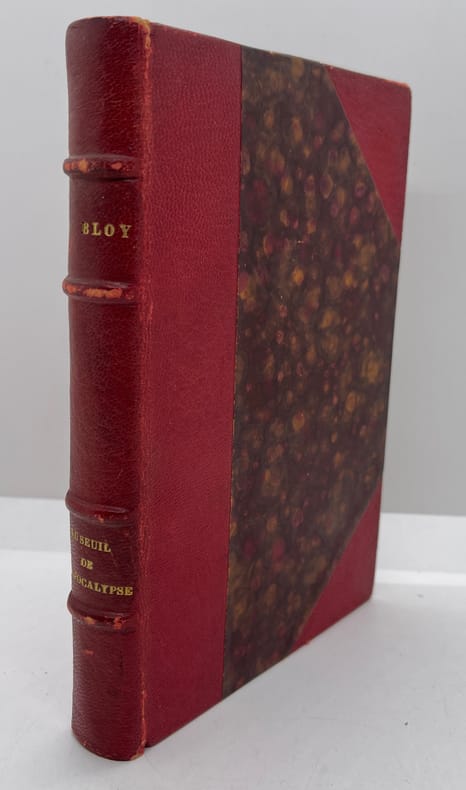 Léon Bloy, Au seuil de l'Apocalypse. Paris, Mercure de France, 1916. In-12, 363p. Edition originale, exemplaire sans mention d'édition (n°163). Septième volume du journal de Bloy, couvrant les années 1913 à 1915. Demi-maroquin rouge à coins, dos à nerfs, tête dorée, première couverture conservée, papier un peu jauni. Petites fentes en tête de mors (moins d'un cm). Bon exemplaire, peu commun.