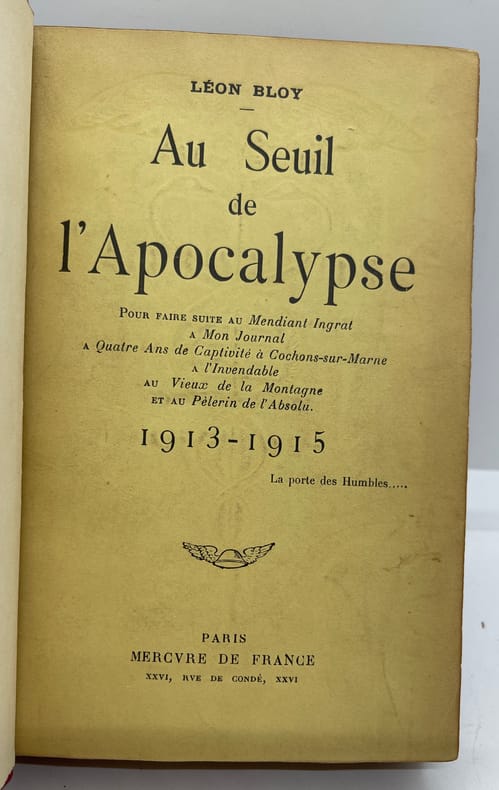 BROCHE BON ETAT Au seuil de l'apocalypse, pour faire suite au mendiant ingrat, à mon journal, à quatre ans de captivité à cochons-sur-marne, à l'invendable, au vieux de la montagne, au pèlerin de l'absolu. 1913-1915. , Bloy, Léon. Mercure de France,1935