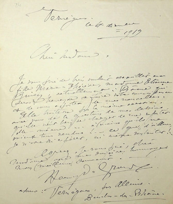 Henry de Groux (1866-1930), peintre, sculpteur belge. L.A.S., Vernègues, 4 décembre 1919, 1p in-4. Sympathique lettre à propos de sa fille à Rome et de dessins qui y sont exposés. « Chère Madame, Je vous prie de bien vouloir accueillir ma fille Marie-Thérèse, madame Etienne Guien, actuellement à Rome qui serait heureuse de faire votre connaissance et de vous apporter de mes nouvelles. Elle traitera par la même occasion avec vous de la question de mes dessins qu'elle veut bien se charger de me rapporter elle-même. à moins qu'ils ne soient tous vendus !. ce que d'ailleurs, je n'ose espérer, ni même [mot illisible] !. Agréez, je vous prie, chère madame, avec mes sincères hommages, mon meilleur souvenir. Henry de Groux. Adresse : Vernègues, par Alleins. Bouches-du-Rhône ». [361]