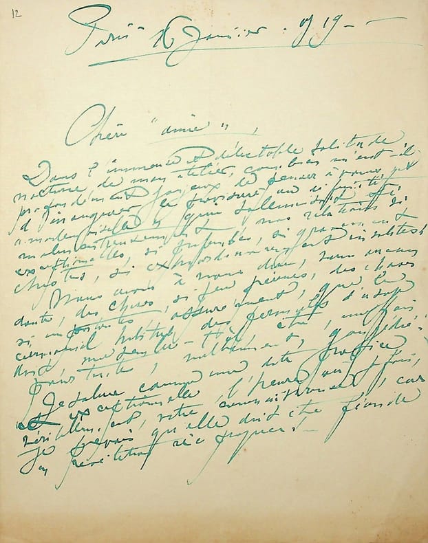 Henry de Groux (1866-1930), peintre, sculpteur belge. L.A. (brouillon), Paris, 16 janvier 1919, 1p in-4. Lettre amicale. « Chère "amie", Dans l'immense et délectable solitude nocturne, de mon atelier, combien m'est-il profondément joyeux de penser à vous, et d'inaugurer le [mots illisibles] de l'amitié [mots illisibles] et qui solennisa si malencontreusement & nos relations si exceptionnelles, si profondes, si gracieuses & [chaotiques?], si extraordinairement insolites ! Nous avons à nous deux, sans aucun doute, des choses si peu [mot illisible], des choses si inconstantes, assurément, que le cérémonial habituel des formules d'usage [mots illisibles] une fois pour toutes, malheureusement, [mot illisible]. Je salue comme une date propice et exceptionnelle l'heure où où je ferai, véritablement, votre connaissance, car je prévois qu'elle doit être féconde [mots illisibles] ». Sympathique lettre. [361]
