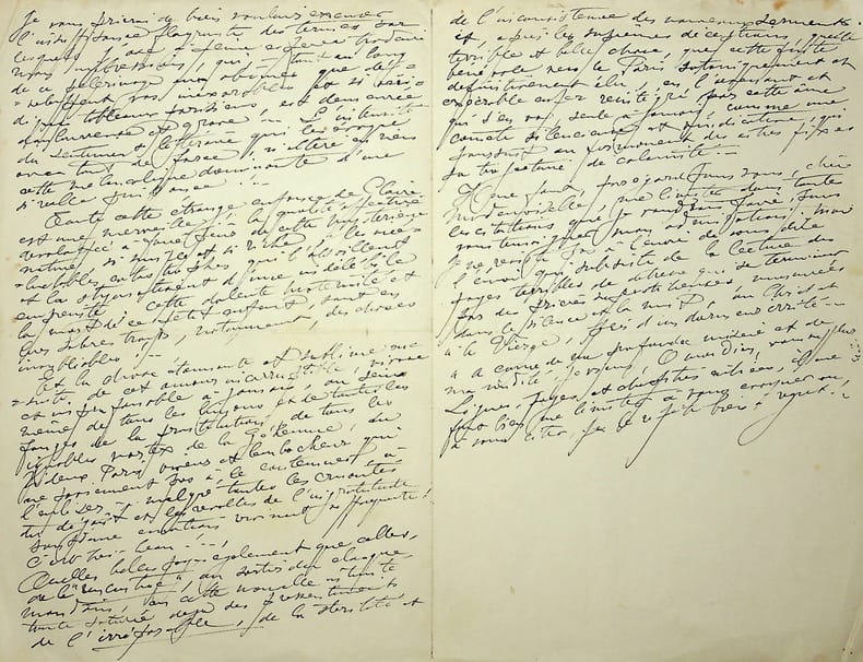Henry de Groux (1866-1930), peintre, sculpteur belge. L.A. (brouillon), sd [1926], 3p in-8. Très belle lettre sur l'ouvrage de sa correspondante : « Chère Mademoiselle, Je serais vraiment bien peu digne de la grande et profonde joie d'art que je voudrais si je tardais à vous en fait part ! Croyez que jamais l'oubli ou l'ingratitude ne furent sans moins de part en mon silence et permettez-moi tout d'abord de m'en justifier. c'est à Vernègues, non loin de Vaucluse, que je suis depuis plusieurs semaines, occupé à l'exécution de ma grande statue destinée au monument aux morts de La Roque d'Anthéron que j'ai assuré de finir et de mouler ici-même, sans le secours d'aucun auxiliaire suffisant. Au sortir de ce travail de [mot illisible], je ne me suspends pas sans étonnement la plume à la main, malgré mes charmantes obligations, de vous accuser réception de votre beau et poignant livre qui me fut en cette solitude, et au milieu des péripéties de cet aride labeur, rien moins qu'une manne céleste. J'ai cependant tellement perdu la notion et l'usage de la plume et de l'écriture au cours des manutentions forcenées de manouvriers et de prise de la sculpture, que je vous prierai de bien vouloir excuser l'insuffisance flagrante des termes par lesquels j'ose à peine [mot illisible] traduire mon impression, qui, tout au long de ce pèlerinage aux abimes que [déversent ?] vos inexorables et si véridiques tableaux parisiens, est demeurée douloureuse et grave. l'intensité du sentiment littéraire qui les [mot illisible] avec tant de force n'altère en rien cette mélancolique dominante d'un si réelle puissance. Toute cette étrange enfance de Claire est une merveille ! La qualité affective [mot illisible] à faire sens de cette mystérieuse nature, si simple et si riche, [mot illisible] inéluctables [mot illisible] qui l'assaillent et la [mot illisible] d'une indélébile empreinte , cette dolente maternité et la mort de ce petit enfant sont les sobres traits, notamment, des choses inoubliables !. Et la chose étonnante et sublime ensuite de cet amour incorruptible, vivace et [mots illisibles] au sein même de tous les [mot illisible] et toutes les fanges de la prostitution, de tous les ignobles vortex de la Géhene, du hideux Paris [mots illisibles] qui ne parviennent pas à le contenir, à l'enliser, malgré toutes les cruautés du dégoût et les révoltes de l'ingratitude sont d'une émotion vraiment suffocante[?] ! C'est très beau !. Quelles belles pages également que celles de la "rencontre", au sortir du cloaque, mondain[?], vers cette nouvelle intimité toute saturée déjà des pressentiments de l'irréparable, de la stérilité et de l'inconsistance des [mot illisible] serments, et, après les suprêmes déceptions, quelle terrible et belle chose que cette fuite bénévole vers le Paris sataniquement et définitivement élu, en l'[mot illisible] et exécrable enfer réintégré par cette âme qui s'en va, seule à jamais, comme une comète silencieuse et vindicative, qui soustrait au foisonnement des astres fixes sa trajectoire de calamité. Il me faut, par égard pour vous, chère mademoiselle, me limiter dans toutes les citations que je voudrais faire, sans vous témoigner mon admiration. Mais je ne resite pas à l'envoie de vous dire l'émoi qui subsiste de la lecture des pages terribles de détresse qui se terminent par des prières superstitieuses, mesurées dans le silence et la nuit, au Christ et à la Vierge, pris d'un [mot illisible] irrité. « à cause de ma profonde misère et de ma nudité, je viens, O mon dieu, vous supplier.»[citation de l'imitation de Jésus-Christ]. [fin à peu près illisible] ». Belle lettre mentionnant son monument à La Roque d'Anthéron. [361]