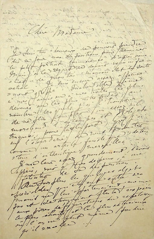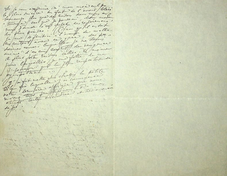 Henry de Groux (1866-1930), peintre, sculpteur belge. L.A. (brouillon), sd, 2p in-8. A la baronne de Brimont. Sur la fin d'un portrait et un escroc qui l'a abusé. « Chère Madame, Je suis très heureux de pouvoir prendre dès ce jour mes dispositions pour terminer le petit portrait commencé d'après vous mais j'ai le regret de devoir vous informer de mon très mauvais état de santé actuel. Je suis encore assez affreusement grippé. Inabordable même à mes amis ou à mes hôtes les plus dévoués ou les plus intrépides, au nombre desquels j'ai l'honneur de ne plus compter un assez vil marchand d'estampes et d'objets truqués, pour la plupart, que j'ai eu l'étourderie de vous présenter comme un artiste fanatique, détenteur d'authentiques merveilles !. Je me [mot illisible] assez grandement, d'avoir appris, voir à mes dépens, à me féliciter de sa disparition. Au surplus, les quelques objets appréciables qui étaient entre ses mains ne lui appartenaient même pas et se trouvaient plutôt exposés aux pires [mot illisible] du rapetassage le plus éhonté et le plus astucieux où l'on ne peut même pas dire qu'il existe. Si je vous exprime ici mon mea culpa le plus sincère du fait de l'avoir toléré beaucoup plus que de raison dans mon entourage, c'est que je pourrais, chère madame, vous donner à ce sujet des références des plus précises. Quoi qu'il en soit, je me défendrai à l'avenir de mettre en contact avec ce grec des personnes envers lesquelles je ne serai animé d'aucun esprit de vengeance, à plus forte raison celles-là même pour lesquelles je me flatte de ne professer que la plus respectueuse sympathie. J'ai fait mettre sur châssis la petite toile sur laquelle j'ai commencé votre dernière effigie que vous reverrez tout prochainement à mon atelier toute encadrée et très avancée déjà ». Belle lettre. [361]