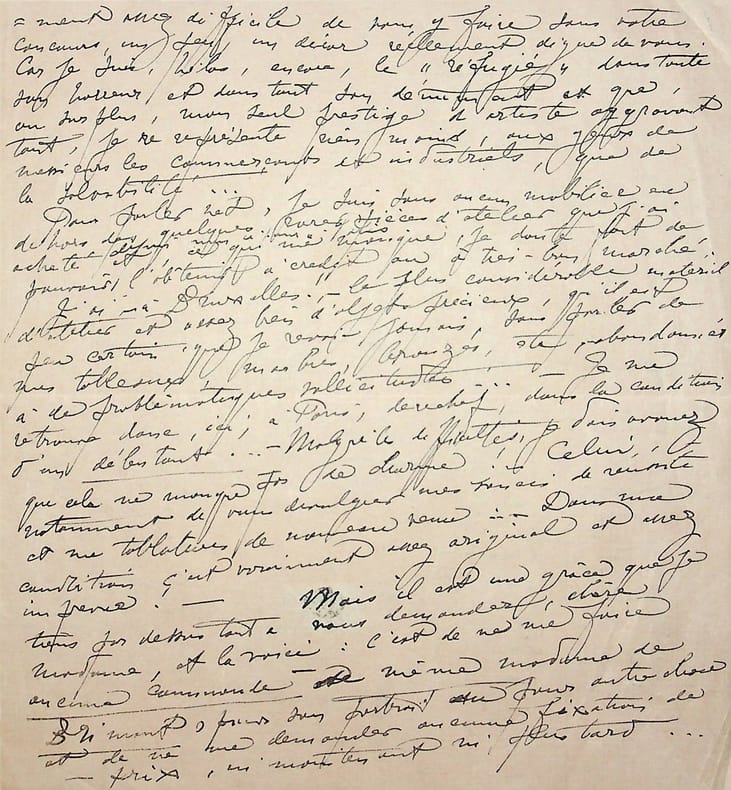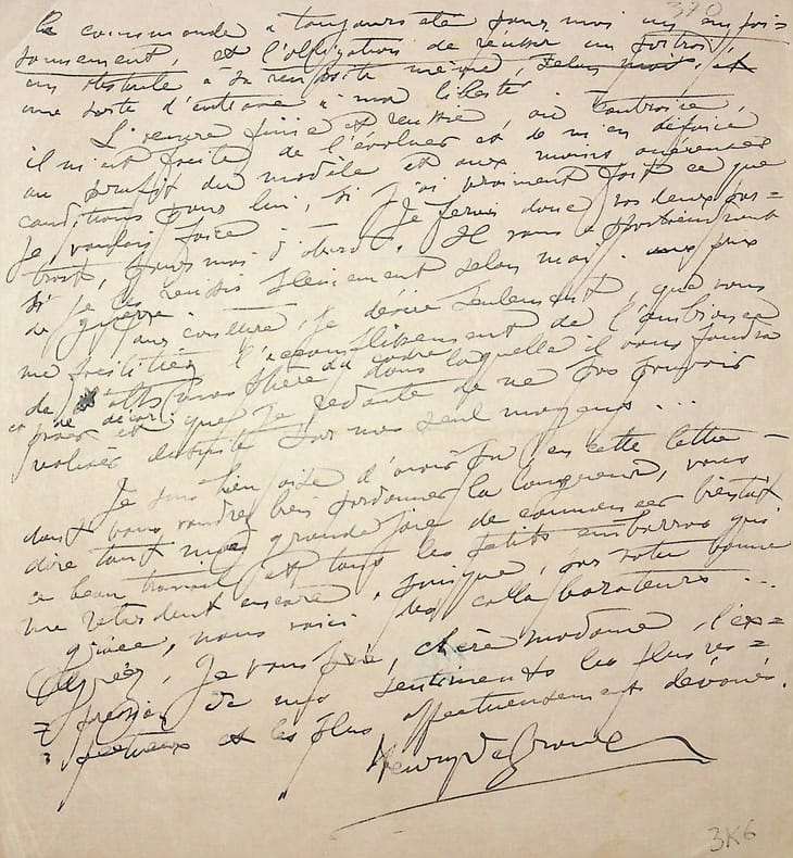 Henry de Groux (1866-1930), peintre, sculpteur belge. L.A.S. (brouillon, fin d'une lettre), sd, 2p in-4. A Elisabeth de Gramont (1875-1954), duchesse de Clermont-Tonnerre. Très belle lettre sur ses difficultés d'artiste et financières. « . assez difficile de nous y faire sans votre concours, un peu, un décor réellement digne de vous. Car je suis, hélas, encore, le "réfugié" dans tout son horreur, et dans tout son dénuement et que, au surplus, mon seul prestige d'artiste aggravant tout, je ne représente rien mois, aux yeux de messieurs les commerçants et industriels, que de la solvabilité. Pour parler net, je suis sans aucun mobilier en dehors des quelques rares pièces d'atelier que j'ai acheté depuis [mots illisibles entre les lignes] et, ce qui me manque, je doute fort de pouvoir l'obtenir à crédit ou à très-bon marché. J'ai, à Bruxelles, le plus considérable matériel d'atelier et assez bien d'objets précieux, qu'il est peu certain que je revois [mot illisible] sans parler de mes tableaux, marbres, bronzes, etc. abandonnés à de problématiques vicissitudes. Je me retrouve donc, ici, à Paris, derechef, dans les conditions d'un débutant. Malgré les difficultés, je dois avouer que cela ne manque pas de charme ! Celui, notamment, de vous divulguer mes pensées(?) de réussite et mes [mot illisible] de nouveau venu. Dans ma condition, c'est vraiment assez original et assez imprévu ! Mais il est une grâce que je tiens par dessus tout à vous demander, chère madame, et la voici : c'est de ne me faire aucune commande et même madame de Brimont, pour son portrait et pour autre chose et de ne me demander aucune fixation de prix, ni maintenant, ni plus tard. La commande a toujours été pour moi un empoisonnement et l'obligation de réussir un portrait, un [mot illisible] à sa réussit même, une sorte d'entrave à ma liberté. L'oeuvre finie est réussie, au contraire, il m'est facile de l'évaluer et de m'en défaire au profit du modèle et aux moins onéreuses conditions pour lui, si j'ai vraiment fait ce que je voulais faire. Je ferai donc vos deux portraits, pour moi d'abord. Il vous appartiendront si je les réussis pleinement selon moi. Aux prix de guerre. Au [mot illisible], je désire seulement que vous me facilitiez l'accomplissement de l'ambiance de l'atmosphère du cadre dans laquelle il vous faudra poser et que je redoute de ne pas pouvoir réaliser de suite par mes seuls moyens. Je suis bien aise d'avoir pu, en cette lettre, dont vous voudrez bien pardonner la longueur, vous dire toute ma grande joie de commencer bientôt ce beau travail et tous les petits embarras qui me retardent encore, puisque, par votre bonne grâce, nous voici des collaborateurs. Agréez, je vous prie, chère madame, l'expression de mes sentiments les plus respectueux et les plus affectueusement dévoués. Henry de Groux ». [361]