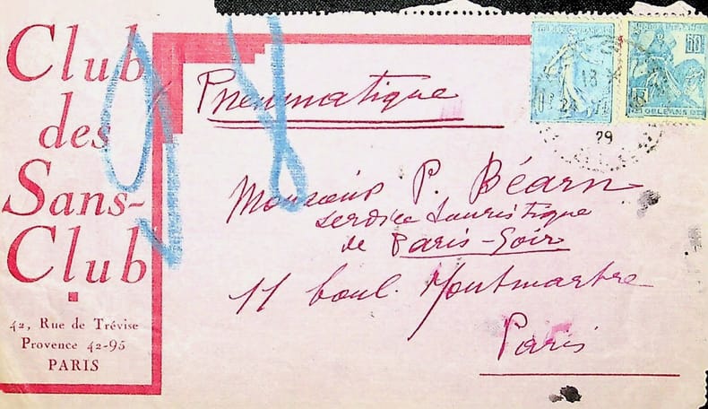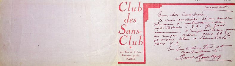 Paul Poulgy (XXe), écrivain. L.A.S., sd [cachet de 1929], 1p in-12. A l'écrivain et libraire Pierre Béarn (1902-2004). Sur papier à entête du Club des Sans-Club. Il ne peut venir au rendez-vous proposé. 1929 est l'année des débuts de Béarn. Il publie son Paris Gourmand. [365]