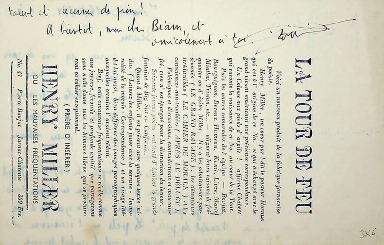 Pierre Boujut (1913-1992), poète, écrivain. L.A.S., Jarnac, 16 novemre 1955, 1p 1/4 in-8. A l'écrivain et libraire Pierre Béarn (1902-2004). Sur un papier à lettre de La Tour de Feu avec au dos un prière d'insérer pour son livre sur Henry Miller (Boujut a écrit dans les marges au dos). Il lui envoie des plaquettes d'Adrian Miatlev (1910-1964) et lui écrit pour qu'il lui envoie « poème et photo ». Il mentionne aussi la diffusion de son livre sur Miller. [365]
