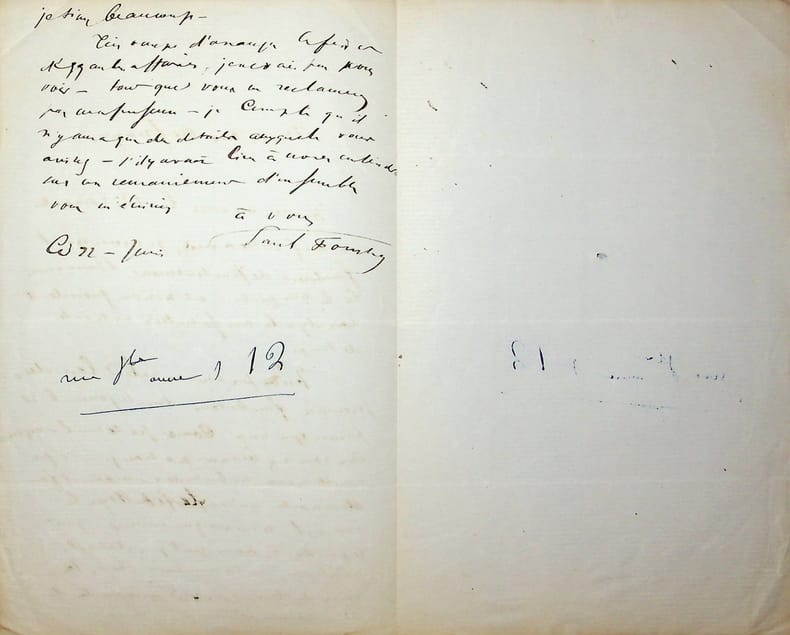 Paul Foucher (1810-1875), écrivain, journaliste, beau-frère de Victor Hugo. L.A.S., 22 juin [années 1860?], 1p 1/2 in-8. A l'écrivain Louis Desnoyers (1802-1868). Lettre difficile à déchiffrer à propos d'une collaboration de Foucher dans un journal de Desnoyers. Il est question du 12e chapitre qui commencera la deuxième partie du feuilleton. [341]
