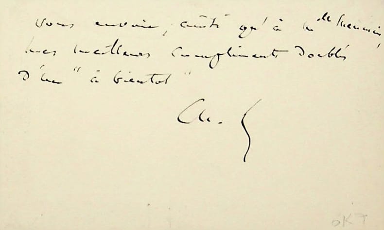 Charles Lefebvre (1843-1917), compositeur, deuxième grand prix de Rome 1870. C.A.S., sd, R°V° (8 lignes). « Chère Madame, Il m'était assez difficile de revenir chez vous à 4h ; je profite donc, puisque Mademoiselle Meunier ne vient pas demain chez Dubufe, de la liberté que vous me rendez - en le regrettant - et je vous envoie, ainsi qu'à Mademoiselle Meunier, mes meilleurs compliments doublés d'un "à bientôt". Ch. L. ». [345]