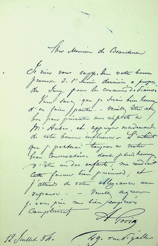 Alexandre Goria (1823-1860), compositeur, pianiste. L.A.S., 12 juillet 1854, 1p in-8. A Alfred de Beauchesne (1804-1876), directeur du Conservatoire national de Musique. Il lui demande son intervention auprès du compositeur Esprit Auber (1782-1871) afin de faire partie du jury pour les concours de piano. Belle lettre. Les autographes de Goria sont peu communs. [344]