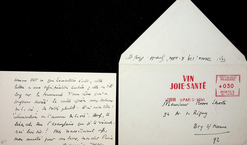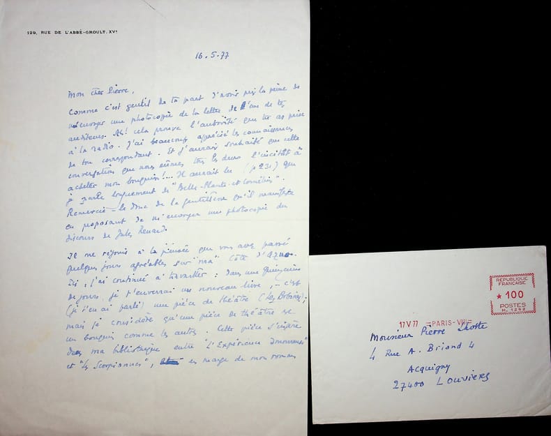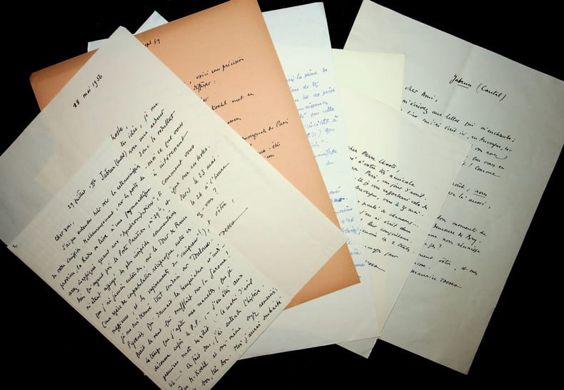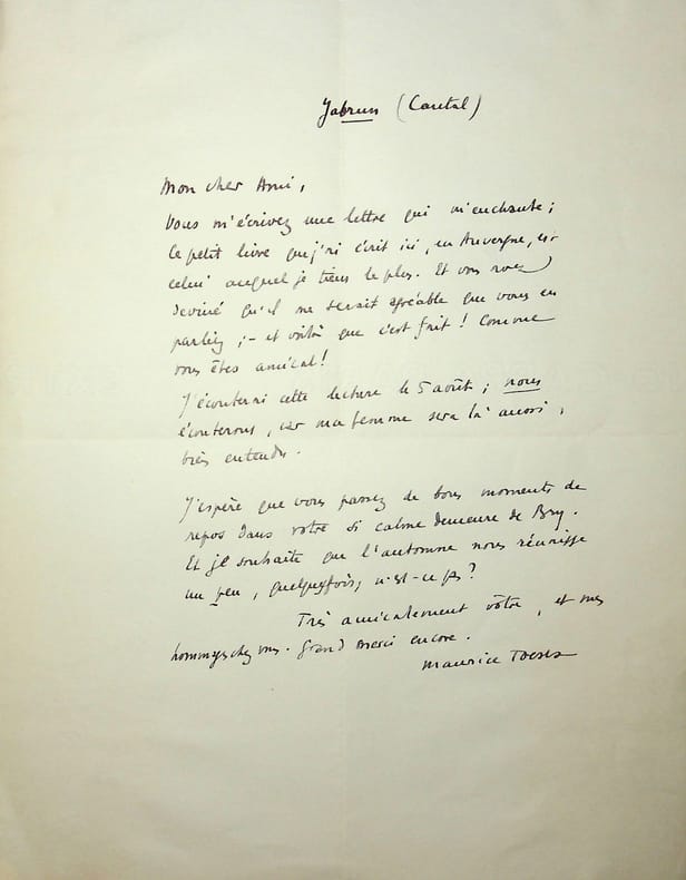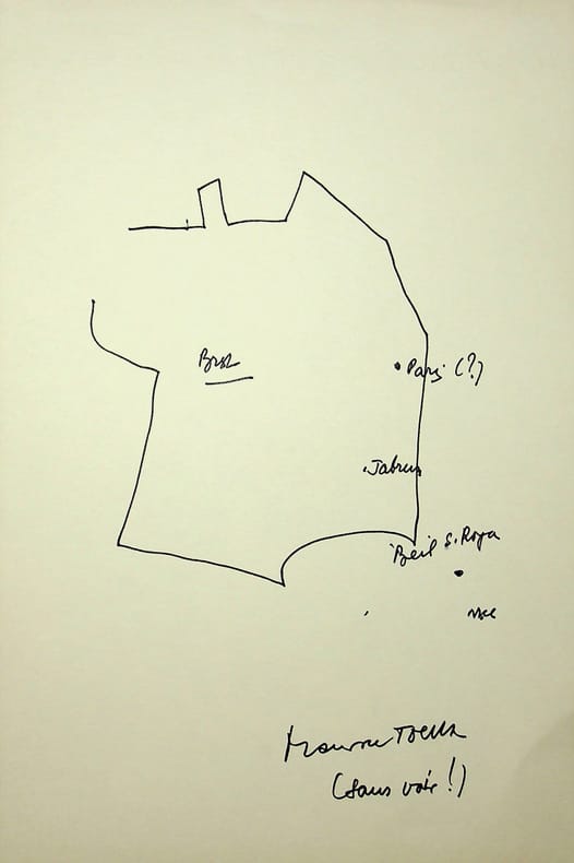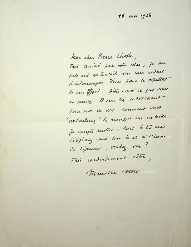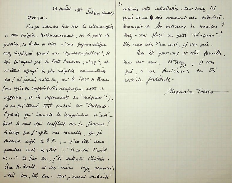 Maurice Toasca (1904-1998), écrivain. Lot de 7 L.A.S. & 1 dessin, 1956-1977, formats divers, 9p. Au journaliste Pierre Lhoste (1913-1984). Correspondance amicale, faisant quelques références aux émissions radios de Lhoste. Le dessin représente une carte de France avec des plusieurs villes indiquées, dessin fait « sans voir » comme il l'indique. Bel ensemble. [343]