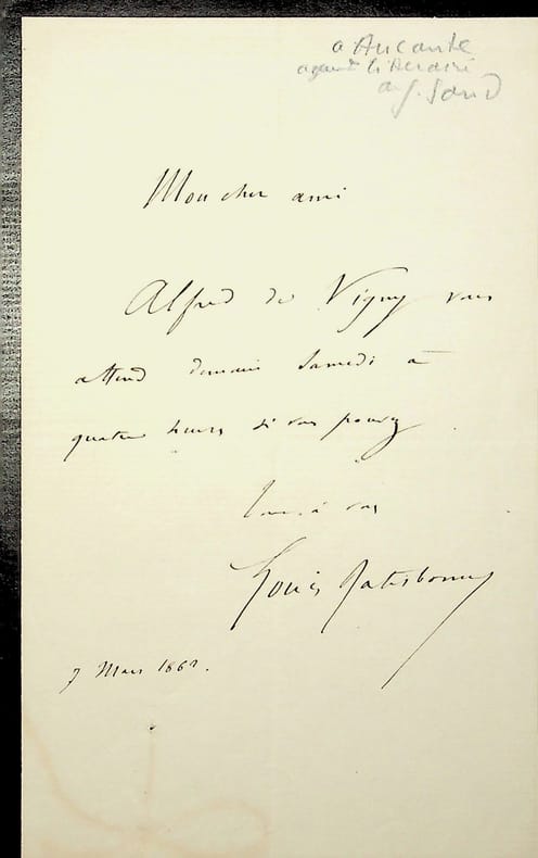 [Alfred de Vigny] Louis Ratisbonne (1827-1900), homme de lettres, journaliste. L.A.S., 7 mars 1862, 1p in-8. A l'écrivain Emile Aucante (1822-1908) : « Alfred de Vigny vous attend demain samedi à quatre heures si vous pouvez. ». [89]