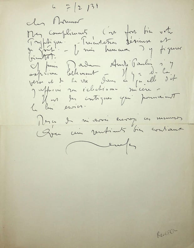 Raymond Renefer (1879-1957), peintre, illustrateur, graveur. L.A.S., 7 février 1938, 1p in-4. A R de Brus, rédacteur en chef de la revue Triptyque. « Cher Monsieur, Mes compliments, c'est fort bien votre Triptyque. Présentation sérieuse et de goût. Je suis heureux d'y figurer bientôt. Et puis Madame André Paulin s'y exprime bellement. Il y a de la verve et de la vie dans ce qu'elle dit. J'apprécie son éclectisme sincère. Il est des critiques qui pourraient lui envier. Merci de m'avoir envoyer ces numéros. Avec mes sentiments bien cordiaux. Renefer ». Le n°116, de mars 1938, aura en effet un article d'André Paulin sur Renefer. [91]