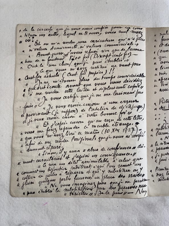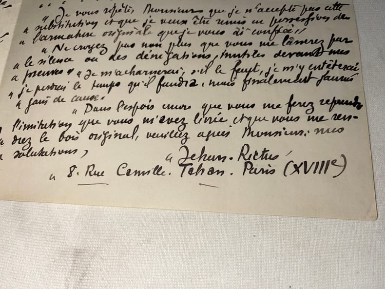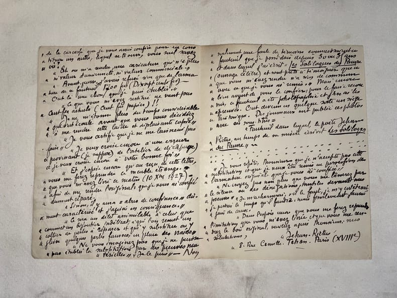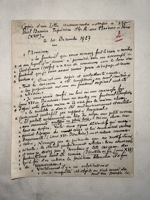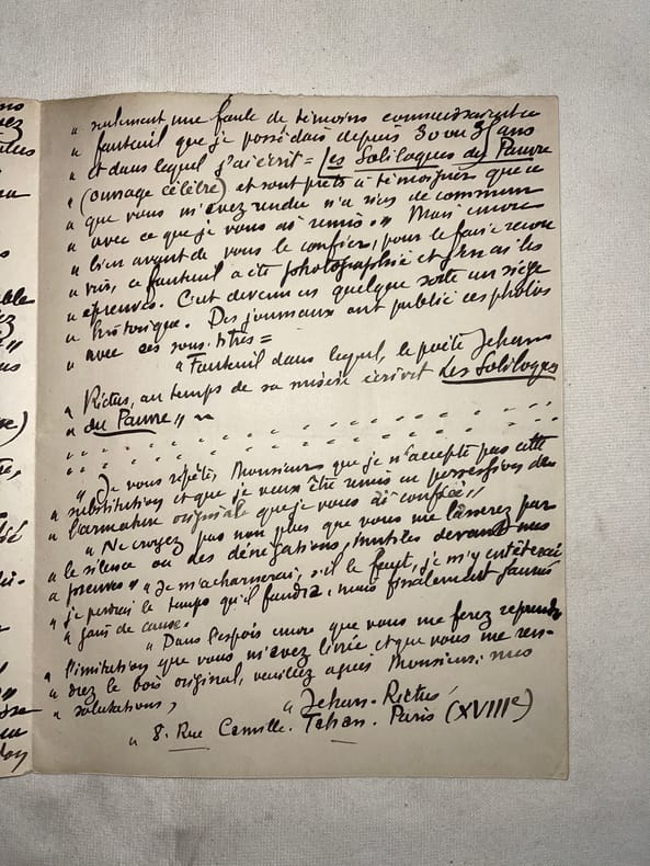 Gabriel Randon dit Jehan-Rictus (1867-1933), poète, célèbre auteur des Soliloques du Pauvre. L.A.S., 10 décembre 1927, 3p in-4. Copie autographe de la lettre recommandée envoyée à son tapissier, Paul Barrier, 4 rue des Moines à Paris. Rictus s'y plaint longuement que le fauteuil qui lui a été renvoyé est une fauteuil sans valeur alors qu'il lui avait envoyé un fauteuil d'époque Louis XVI ou Directoire (fin du XVIIIe siècle) et dont la valeur est importante. Il avait refusé, avant guerre, une offre de 1700 francs (somme considérable à l'époque) et il peut prouver cette valeur. Ce fauteuil est d'autant plus important qu'il a écrit son chef-d'oeuvre, Les Soliloques du Pauvre, en y étant assis. Il menace le tapissier de poursuite s'il ne règle pas le problème. Nous ne savons malheureusement pas les suites de cette affaire. Très beau document. [167]