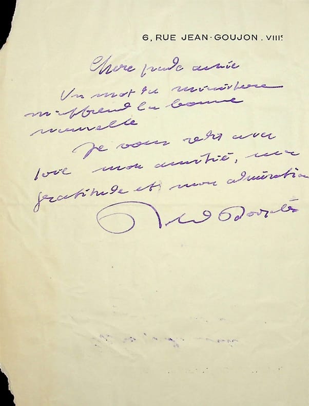Roland Dorgelès (1885-1973), écrivain, membre de l'Académie Goncourt. L.A.S., Antibes, sd, 1p in-8. A Jane Catulle Mendès (1867-1955). « Chère Madame, Votre gentille pensée me touche infiniment et c'est de tout coeur que je vous diq merci. On aime à lire certaines choses quand elles sont signées d'un nom qu'on aime. Votre respectueusement dévoué Roland Dorgelès ». [378]