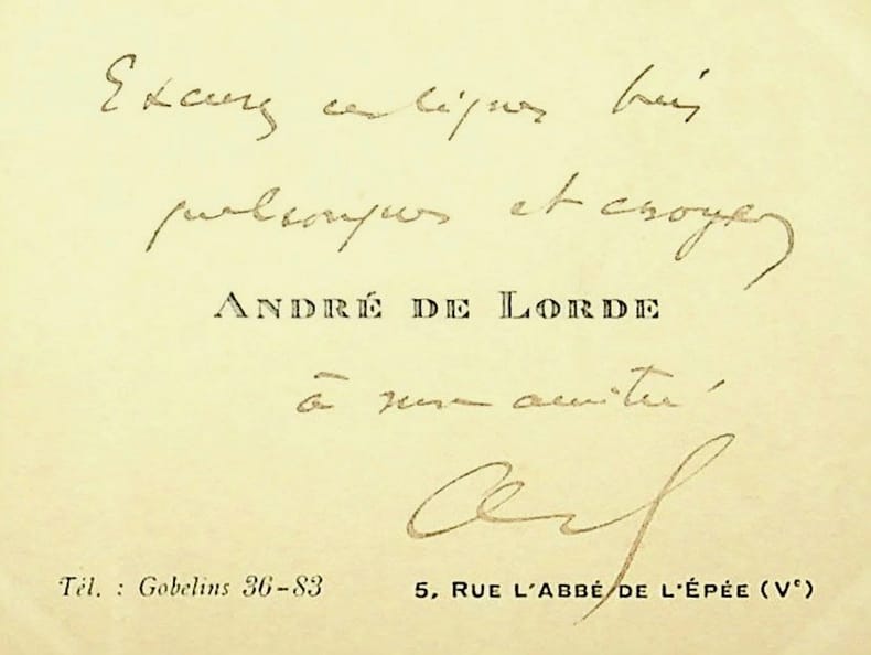André de Lorde (1869-1942), écrivain, prince de la terreur. C.A.S., sd, 3 lignes. « Excusez ces lignes bien quelconques et croyez à mon amitié. AdL » [379]