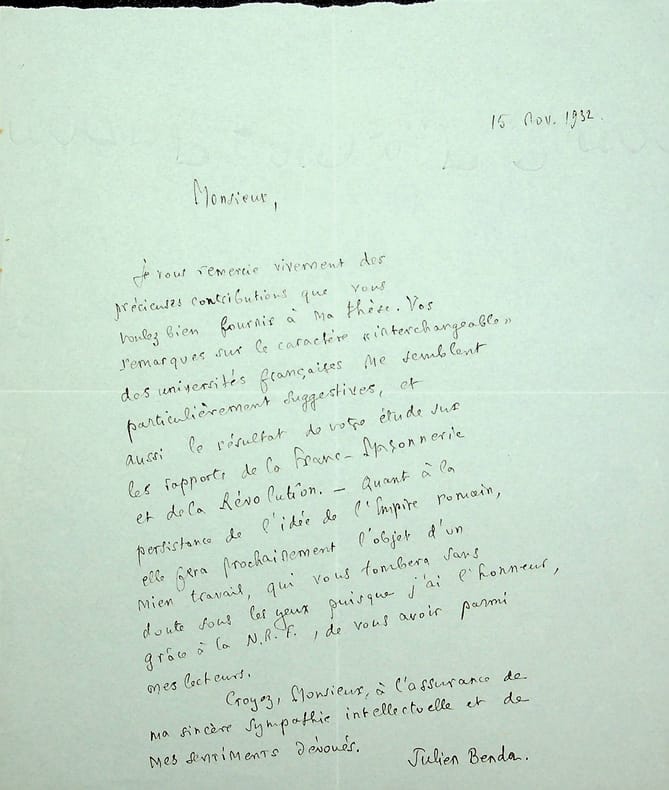 Julien Benda (1867-1956), écrivain, philosophe. L.A.S., 15 novembre 1932, 1p in-4. « Monsieur, je vous remercie vivement des précieuses contributions que vous voulez bien fournir à ma thèse. Vos remarques sur le caractère "interchangeable" des universités françaises me semblent particulièrement suggestives, et aussi le résultat de votre étude sur les rapports de la Franc-Maçonnerie et de la Révolution. Quant à la persistance de l'idée de l'Empire romain, elle fera prochainement l'objet d'un mien travail, qui vous tombera sans doute sous les yeux puisque j'ai l'honneur, grâce à la N.R.F., de vous avoir parmi mes lecteurs. ». Sympathique lettre. [379]