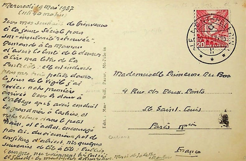 Charles Du Bos (1882-1939), écrivain. L.A.S., 19 mai 1937, 1p in-12. A sa fille Primerose Du Bos. « Tous mes souhaits de bienvenue à la jeune jéciste pour son "insularité retrouvée". Demande à ta maman d'avoir la bonté de te donner à lire ma lettre de la Pentecôte. Elle est indivisée pour mes trois petits [mot illisible]. Le jour de la Vigile, j'ai revécu notre première arrivée tous les deux à l'abbaye après avoir conduit la grand mère à Castries et notre retour dans le petit [mot illisible] et l'achat - encouragé par toi - du si curieux pot de confiture d'abricot. ». [381]