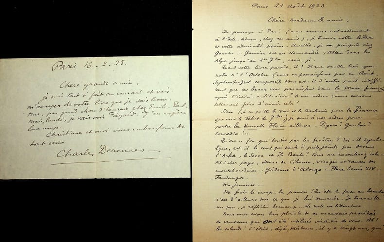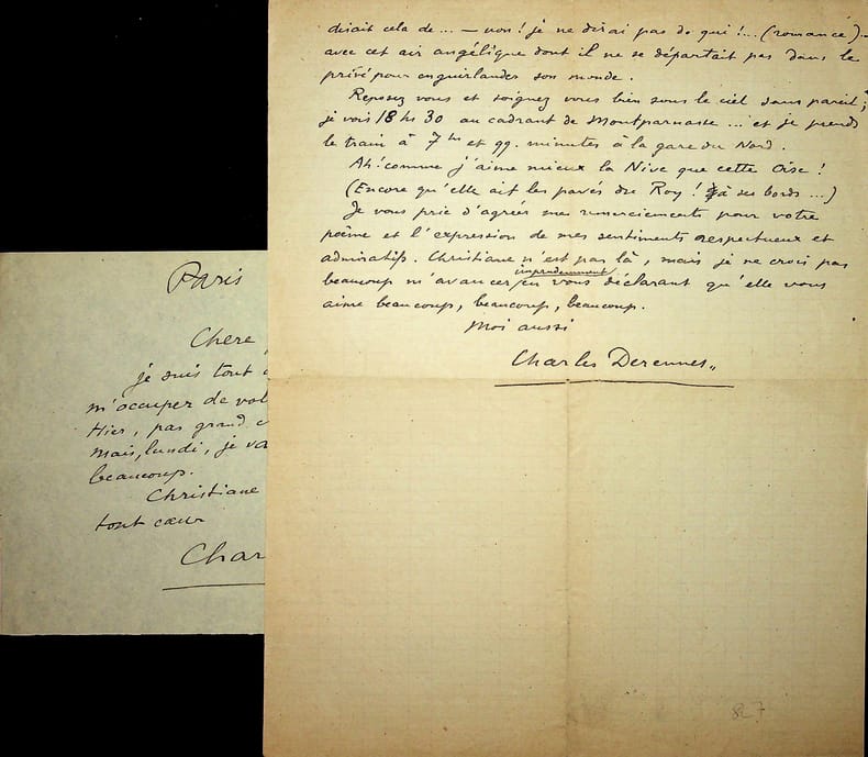 Charles Derennes (1882-1930), écrivain. L.A.S., Paris, 21 août 1923, 1p 1/2 in-4. A la poétesse Jane Catulle-Mendès (1867-1955). Il encense son poème La nouvelle Elvire et lui propose de le publié dans La Muse française. Ce sera le cas (en 1923, p.684). La fin est amusante : « Ma jeunesse. Elle fiche le camp, la pauvre ! Qu'elle le fasse en beauté, c'est d'ailleurs tout ce que je lui demande. Je travaille un peu, je réfléchis beaucoup. Le reste est littérature. Nous vous avons bien plainte de ces mauvais procédés de vautours qui ont été utilisés vis-à-vis de vous. Ah ! Les salauds ! C'était, déjà, Mirbeau, il y a vingt ans, qui disait cela de . - non ! Je ne dirai pas de qui !. (romance) - avec cet air angélique dont il ne se départait pas dans le privé pour enguirlandé son monde ». On joint un petit courrier, probablement à la même, daté du 16 février 1925. Belle lettre. [381]