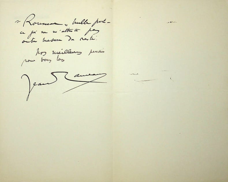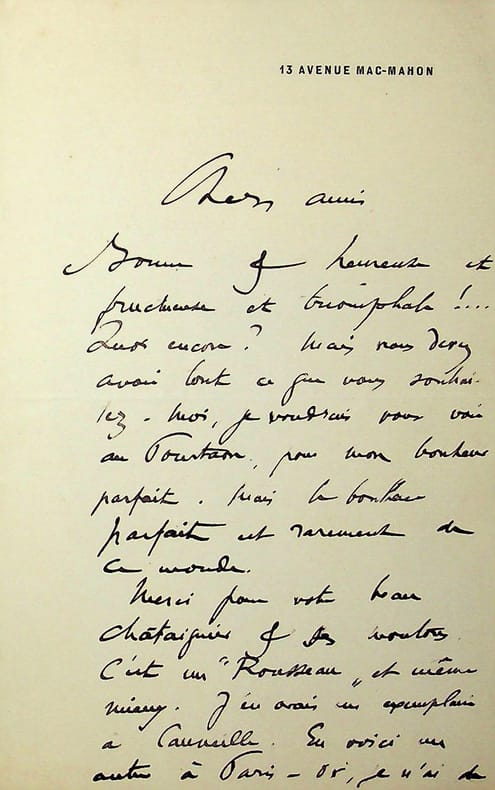Jean Rameau (1858-1942), poète, romancier, membre des Hydropathes. L.A.S., sd, 1p 1/2 in-8. « Cher ami, Bonne & heureuse et fructueuse et triomphale !. Doux encore ? Mais vous devez avoir tout ce que vous souhaitez. Moi, je voudrais vous voir au [mot illisible] pour mon bonheur parfait. Mais le bonheur parfait est rarement de ce monde. Merci pour votre châtaignier & ses [mot illisible]. C'est un "Rousseau" et même mieux. J'en avais un à Cauneille. En voici un autre à Paris. Or, je n'ai de"Rousseau" nulle part - ce qui ne m'attriste pas outre mesure du reste. Mes meilleures pensées pour vous tous. Jean Rameau ». [381]