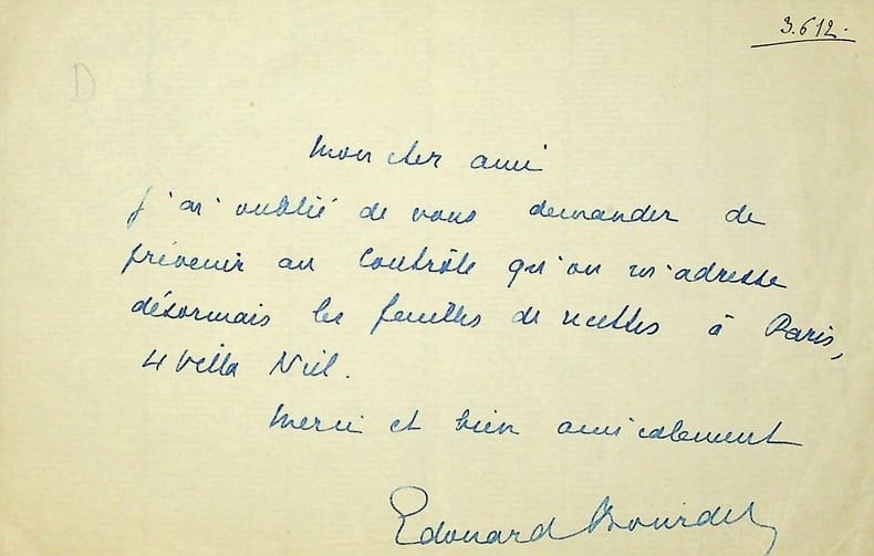 Edouard Bourdet (1887-1945), écrivain, journaliste. L.A.S., sd, 1p in-8 oblong. « Mon cher ami, J'ai oublié de vous demander de prévenir au contrôme qu'on m'adresse désormais les feuilles de recettes à Paris, 4 villa Niel. Merci et bien amicalement. Edouard Bourdet ». [381]