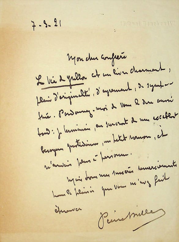 Pierre Mille (1864-1941), écrivain, journaliste. L.A.S., 7 mars 1921, 1p in-8. A l'écrivain Charles Derennes (1882-1930) : « Mon cher confrère, La Vie de Grillon est un livre charmant, plein d'originalité, d'agrément, de sympathie. Pardonnez-moi de vous le dire aussi tard : je terminais, en surcroit de mes accablantes besognes quotidienne, un petit roman, et n'écrivais plus à personne. Mais tous mes sincères remerciements pour le plaisir que vous m'avez fait éprouver. Pierre Mille ». [381]