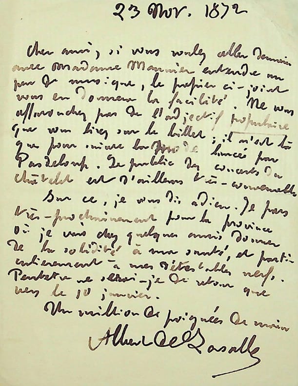 Albert de Lassalle (1833-1886), musicologue. L.A.S., 23 novembre 1872, 1p in-12. A Xavier Marmier (1808-1892) : « Cher ami, si vous voulez aller demain avec madame Marmier entendre un peu de musique, le papier ci-joint vous en donnera la facilité. Ne vous [mot illisible] pas de l'adjectif populaire que vous lirez sur le billet : il n'est là que pour [mot illisible] la mode lancée par Pasdeloup. Le public des concerts du Châtelet est d'ailleurs très convenable. Sur ce, je vous dis adieu. Je pars très prochainement pour la province où je vais chez quelques amis donner de la solidité à ma santé, et particulièrement à mes détestables nerfs. Peut-être ne serai-je de retour que vers le 10 janvier. Un million de poignées de main. Albert de Lassalle ». [382]