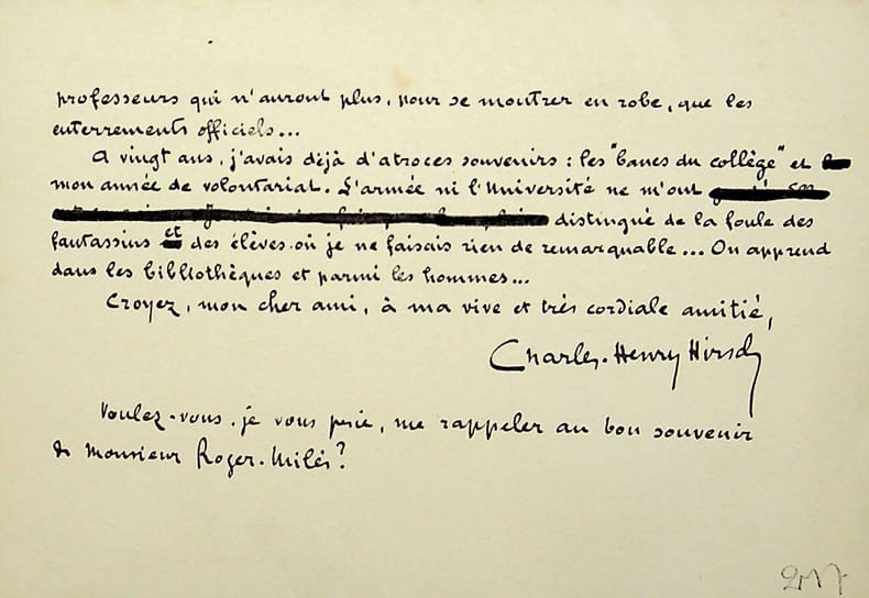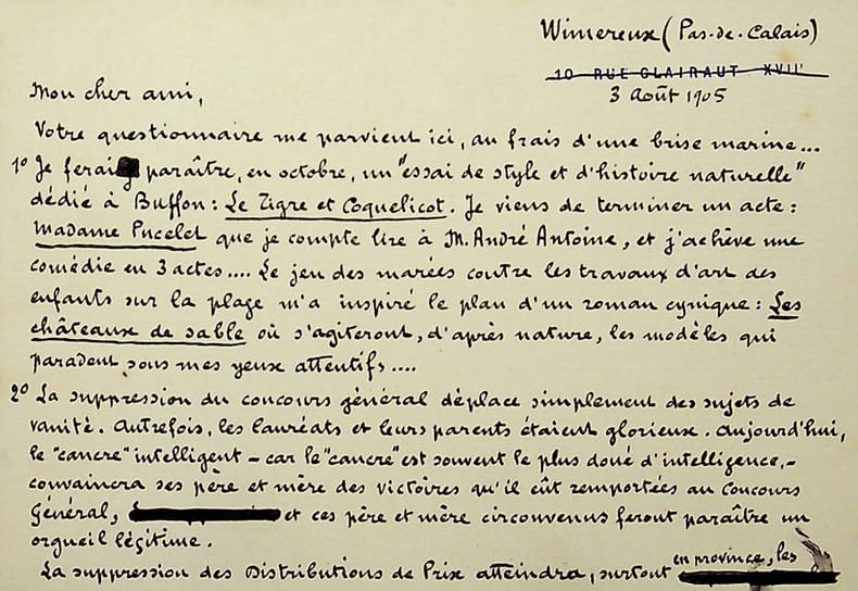 Charles-Henry Hirsch (1870-1948), poète, romancier. L.A.S., Wimereux, 3 août 1905, 2p in-12. A l'écrivain Philippe-Emmanuel Glaser (1874-1930). Il répond au questionnaire de son correspondant en indiquant les ouvrages en cours : Le Tigre et Coquelicot, Madame Pucelet (jamais publié ?) et Les Château de sable (qui sera publié en 1907). Il donne aussi son avis sur la suppression du concours général. Cette réponse fut publiée dans l'ouvrage de Glaser, Le Mouvement Littéraire 1905. [382]