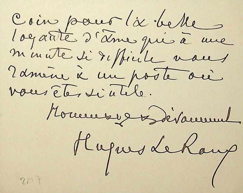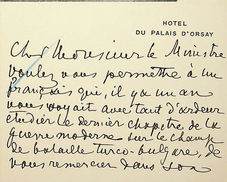 Hugues Le Roux (1860-1925), écrivain. L.A.S., sd [début juin 1914], 2p in-12. « Cher Monsieur le Ministre, voulez-vous permettre à un français qui, il y a un an vous voyait avec tant d'ardeur étudier le dernier chapitre de la guerre moderne sur le champ de bataille turco-bulgare, de vous remercier dans son coin pour la belle loyauté d'âme qui à une minute si difficile vous ramène à un poste où vous êtes si utile. Honneur et dévouement. Hugues Le Roux ». Cette carte est écrite probablement début juin 1914, lors d'un des deux changements de gouvernement (9 et 13 juin). Elle en devient « amusante » quand on sait que la première guerre mondiale sera déclenchée quelques jours plus tard. [382]