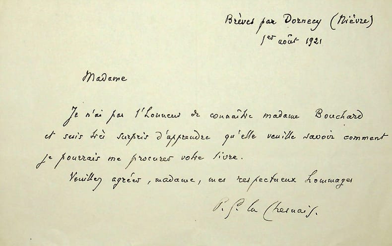 Pierre Georget La Chesnais (1865-1948), écrivain. L.A.S., 1er août 1921, 1p in-8. « Madame, Je n'ai pas l'honneur de connaître madame Bouchard et suis très surpris d'apprendre qu'elle veuille savoir comment je pourrais me procurer votre livre. Veuillez agréer, madame, mes respectueux hommages. P.G. La Chesnais ». [382]