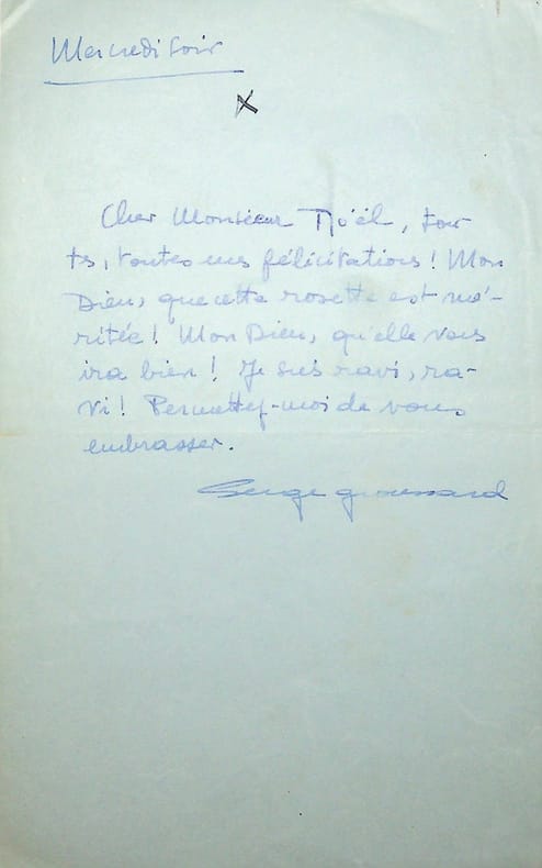 Serge Groussard (1920-2016), écrivain, journaliste. L.A.S., sd [octobre 1953], 1/2p in-8. Au journaliste Maurice Noël (1901-1975). Félicitations pour sa promotion dans la Légion d'Honneur. [382]