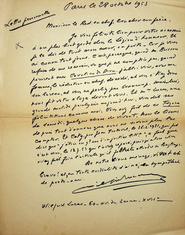 Wilfrid Lucas (1882-1976), poète. L.A.S., 28 octobre 1953, 1p in-4. Au journaliste Maurice Noël (1901-1975). Félicitations pour sa promotion dans la Légion d'Honneur. [383]