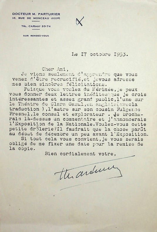 Maurice Parturier (1888-1980), médecin, spécialiste de Mérimée. L.S., 17 octobre 1953, 1p in-8. Au journaliste Maurice Noël (1901-1975). Félicitations pour sa promotion dans la Légion d'Honneur. [383]