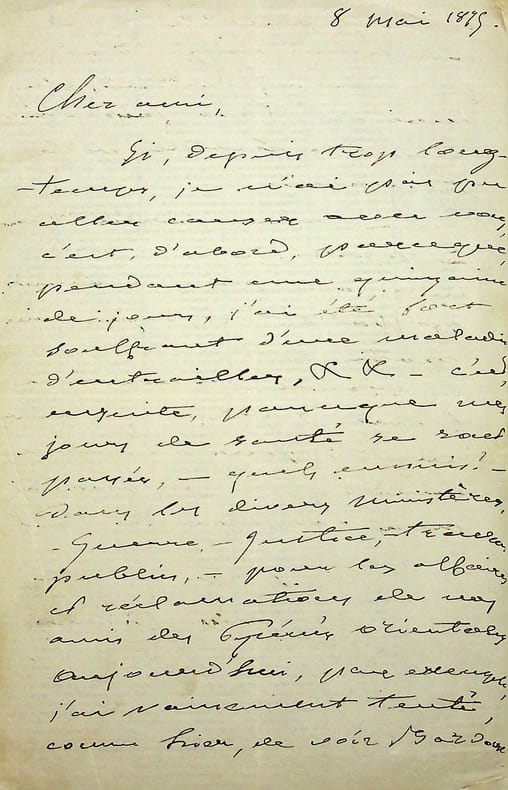 Emmanuel Arago (1812-1896), homme politique, un des « pères fondateurs » de la Troisième République. L.A.S., 8 mai 1875, 2p in-8. Sa santé l'a empêché de répondre et il a beaucoup d'affaire à gérer avec divers ministères - Guerre, justice et travaux publics -, n'a pu voir la veille Agénor Bardoux et ne pourra voir Henri Wallon que le lundi pour le « sursis demandé à Prades » (Pyrénées-Orientales). Wallon est alors à Orléans pour « la grande cérémonie de Jeanne d'Arc ». Peu commun. [383]