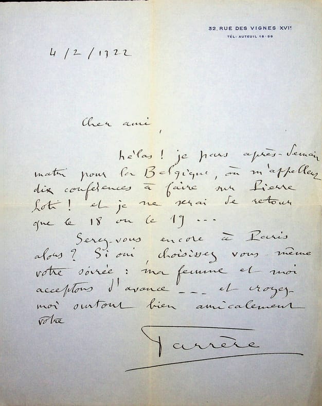 Claude Farrère (1876-1957), écrivain, officier de marine, membre de l'Académie française. L.A.S., 4 février 1922, 1p in-4. « Cher ami, Hélas ! Je pars après-demain matin pour la Belgique, où m'appellent dix conférence à faire sur Pierre Loti ! Et je ne serai de retour que le 18 ou le 19. Serez-vous encore à Paris alors ? Si oui, choisissez vous-même votre soirée : ma femme et moi acceptons d'avance. et croyez-moi surtout bien amicalement votre Farrère ». [383]