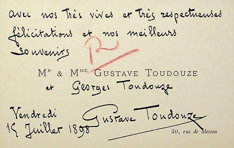 Gustave Toudouze (1847-1904), écrivain, journaliste. C.A.S., 15 juillet 1898, 4 lignes. « Avec nos très vives et très respectueuses félicitations et nos meilleurs souvenirs. [Mr & Mme Gustave Toudouze] et Georges Toudouze. Gustave Toudouze ». [379]