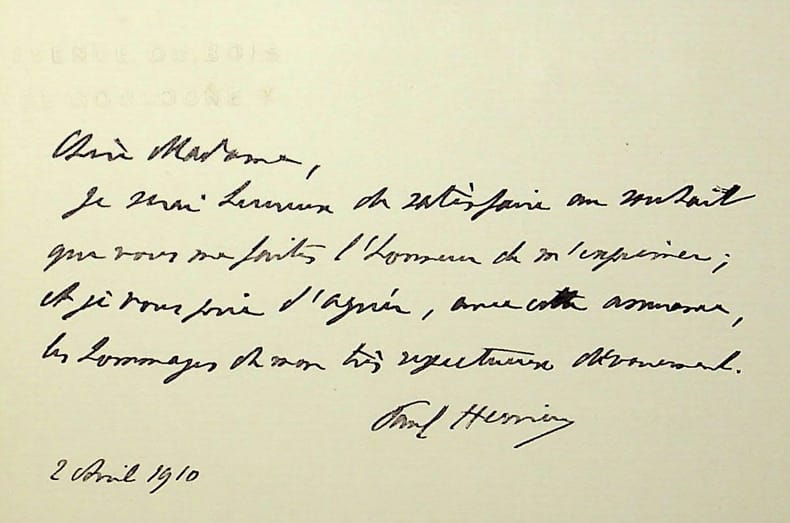 Paul Hervieu (1857-1915), écrivain. L.A.S., 2 avril 1910, 1P in-12. « Chère Madame, Je serai heureux de satisfaire au souhait que vous me faites l'honneur de m'exprimer ! Et je vous prie d'agréer, avec cette assurance, les hommages de mon très respectueux dévouement. Paul Hervieu ». [379]