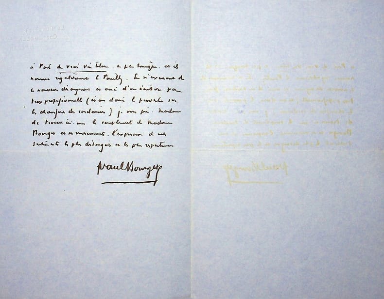 Paul Bourget (1852-1939), écrivain, membre de l'Académie française. L.A.S., 18 janvier 1903, 1p 1/2 in-8. Amusante lettre à une dame dans laquelle il se plaint que l'envoi de vin, du Pouilly 1901, « ait été sifflé en route ». Comme « les médecins recommandent à madame Bourget [.] du vrai vin blanc [et qu'ils] nomment régulièrement le Pouilly », il réclame un nouvel envoi. [379]