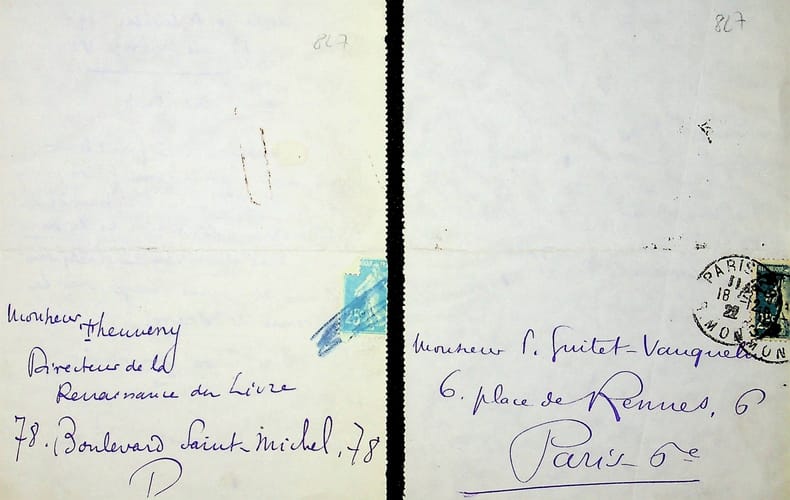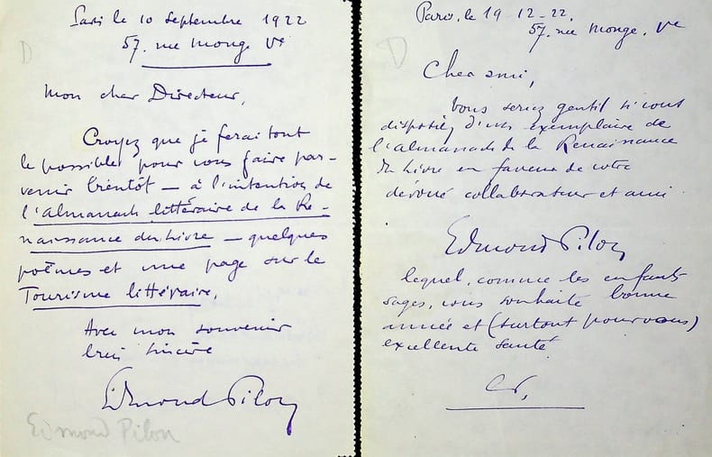 Edmond Pilon (1874-1945), poète, écrivain. 2 L.A.S., 10 septembre & 19 décembre 1922, 2p in-12. Deux lettres concernant l'almanach littéraire de la Renaissance du livre. La première à Louis Theuveny, confirmant sa participation, la seconde à Pierre Guitet-Vauquelin afin d'obtenir un exemplaire de cet almanach. [384]