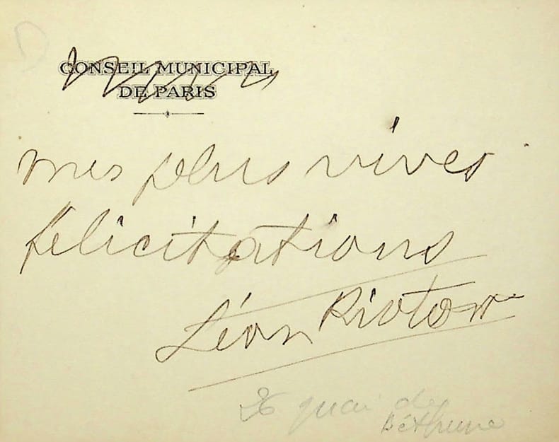 Léon Riotor (1865-1946), écrivain, homme politique. L.A.S., sd, 1p in-12. Court billet sur une carte du conseil municipal de Paris : « mes plus vives félicitations. Léon Riotor ». [384]
