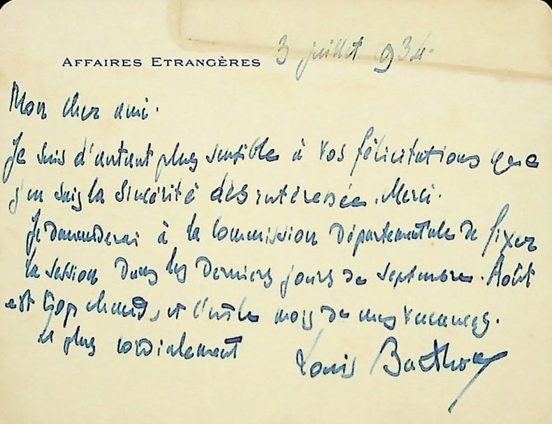 Louis Barthou (1862-1934), journaliste, homme politique. L.A.S., 3 juillet 1934, 1p in-12. Remerciements pour des félicitations. Barthou meurt 3 mois plus tard. [384]