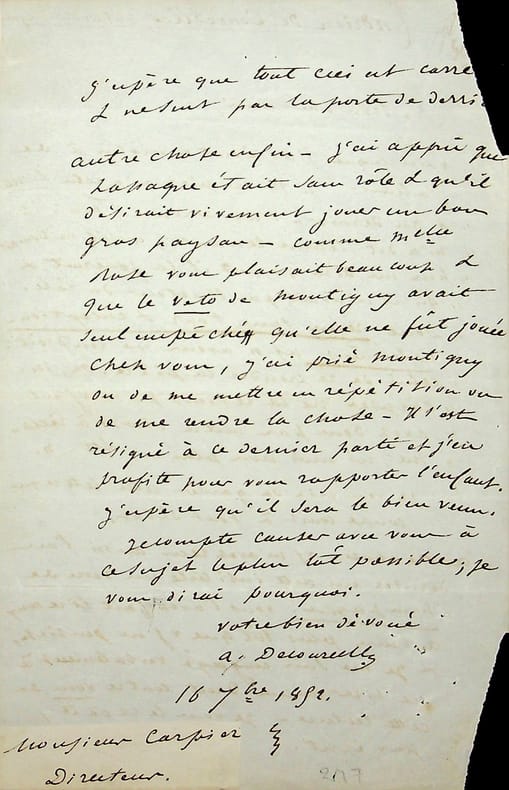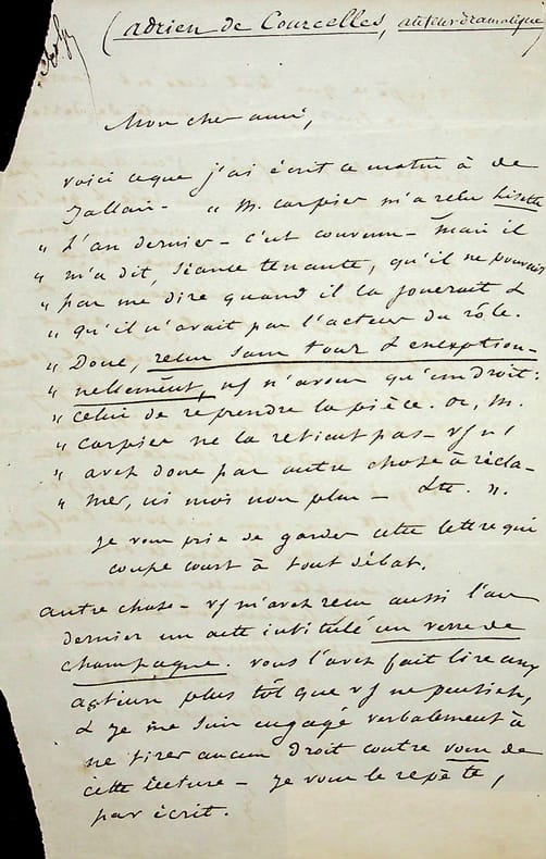 Adrien Decourcelle (1821-1892), écrivain. L.A.S., 16 septembre 1852, 2p in-8. A Anne-Marie Carpier, directeur du théâtre des Variétés. Longue lettre à propos de différentes pièces et reproduisant une lettre de Decourcelle à Amédée de Jallais. 2 manques angulaires mangeant quelques lettres. [384]