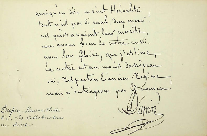 Henri Dupin (1787-1887), écrivain, librettiste, collaborateur d'Eugène Scribe. P.A.S., sd, 1p in-8. Extrait de la pièce écrite en collaboration avec Eugène Scribe, L'Intérieur de l'Etude ou le Procureur et l'avoué (1821). Tirade du personnage Derville dans la scène XVIII de l'oeuvre. Peu commun. [384]