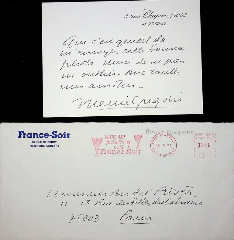 Menie Grégoire (1919-2014), écrivain, journaliste. L.A.S. + enveloppe, 10 avril 1992, 1p in-8. A André Privès (?). « que c'est gentil de m'envoyer cette bonne photo. Merci de ne pas m'oublier. Avec toutes mes amitiés. Menie Grégoire ». [384]