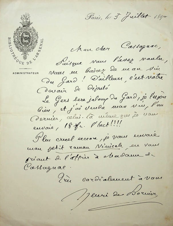 Henri de Bornier (1825-1901), poète, écrivain. L.A.S., Paris, 3 juillet 1890, 1p in-4. A Paul de Cassagnac (1842-1904). « Mon cher Cassagnac, Puisque vous l'avez voulu, vous en boirez de mon vin du Gard ! D'ailleurs c'est votre devoir de député. Le Gers sera jaloux du Gard, je l'espère bien, et j'ai vendu mon vin, l'an dernier, celui-là même que je vous envoie, 18 fr l'hect[olitre] !!! Plus cruel encore, je vous envoi mon petit rameau vinicole en vous priant de l'offrir à madame de Cassagnac. Très cordialement à vous. Henri de Bornier ». Amusante lettre. [384]