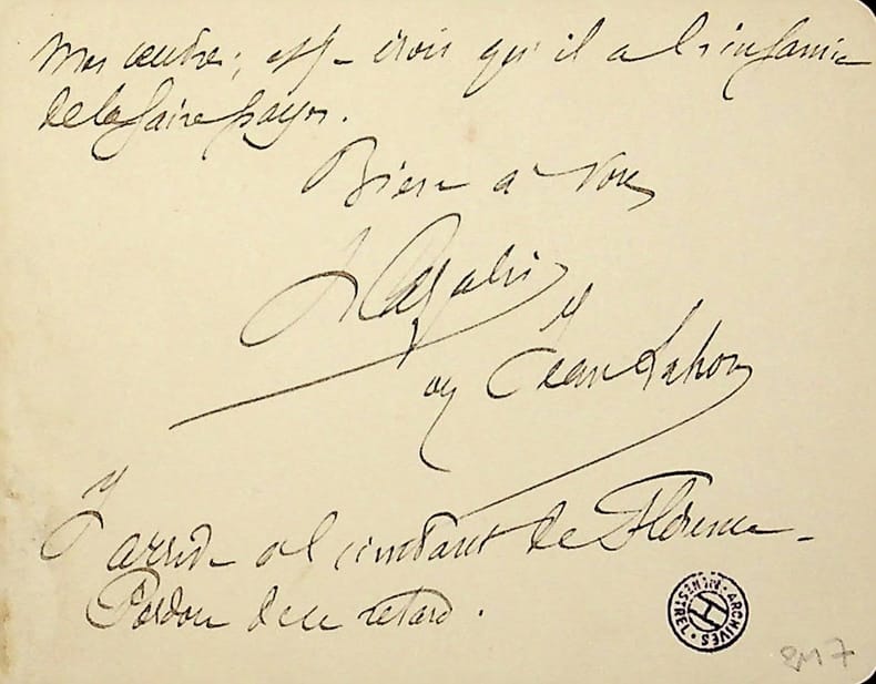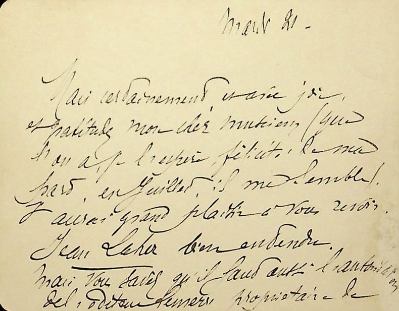 Henri Cazalis (1840-1909), poète, médecin. L.A.S., sd [mardi 21], 2p in-12. « Mais certainement, et avec joie, et [mot illisible], mon cher musicien (que l'on a, je l'espère, félicité de ma part, en juillet, il me semble). J'aurai grand plaisir à vous revoir. Jean Lahor bien entendu. Mais vous savez qu'il faut aussi l'autorisation de l'éditeur Lemerre, propriétaire de mon oeuvre ; et je crois qu'il a l'infamie de la faire payer. Bien à vous Henri Cazalis ou Jean Lahor. J'arrive à l'instant de Florence. Pardon de ce retard ». Ce courrier porte le cachet des archives Heugel. Il s'agit donc clairement d'un projet de mise en musique de poésie de Lahor. Avant sa mort, plusieurs compositeurs avait déjà fait cet exercice : Charles Levadé, Reynaldo Hahn, Ernest Moret, Jules Massenet (liste probablement incomplète). Intéressant document portant la double signature Henri Cazalis et Jean Lahor. [384]