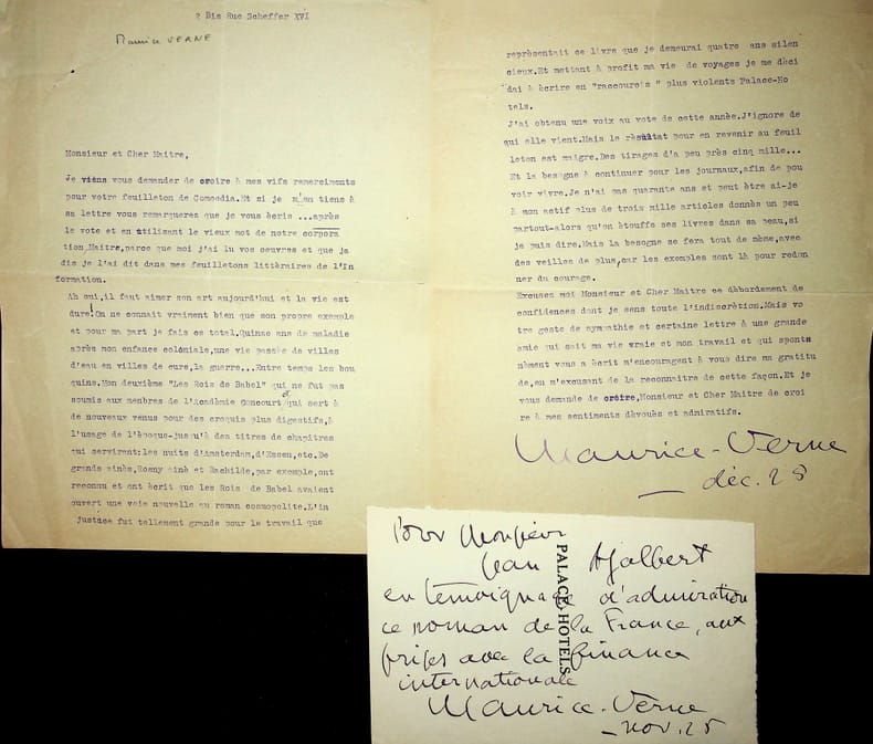 Maurice Verne (1889-1943), romancier. L.S., décembre 1925, 2p in-4. A l'écrivain Jean Ajalbert (1863-1947). Longue lettre de l'auteur qui n'arrive pas au succès. Il sait qu'il a eu une voix au Goucourt en 1925, peut-être pour son livre Palace-Hôtels. On joint un feuillet de faux-titre, avec dédicace à Ajalbert, de Palace-Hôtels. [385]