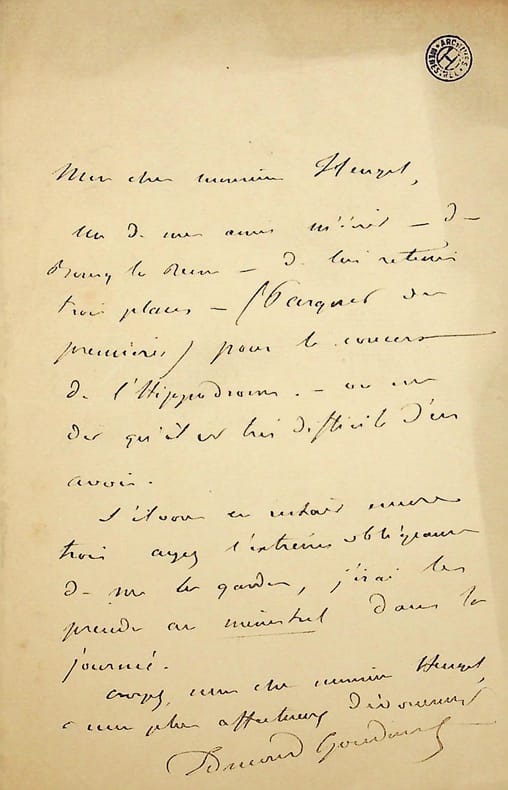 Edmond Gondinet (1828-1888), écrivain, librettiste. L.A.S., sd, 1p in-8. A Heugel. Il demande trois places pour le concert de l'hippodrome, pour un ami. [385]