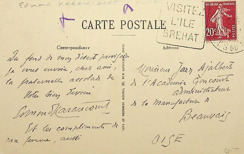 Edmond Haraucourt (1856-1941), poète, écrivain. L.A.S., Ile de Bréhat, 19 août 1925, 1p in-12. A l'écrivain Jean Ajalbert (1863-1947). « du fond de mon désert provisoire, je vous envoie, cher ami, la fraternelle accolade de votre bien dévoué Edmond Haraucourt. Et les compliment de ma femme, aussi ». [385]